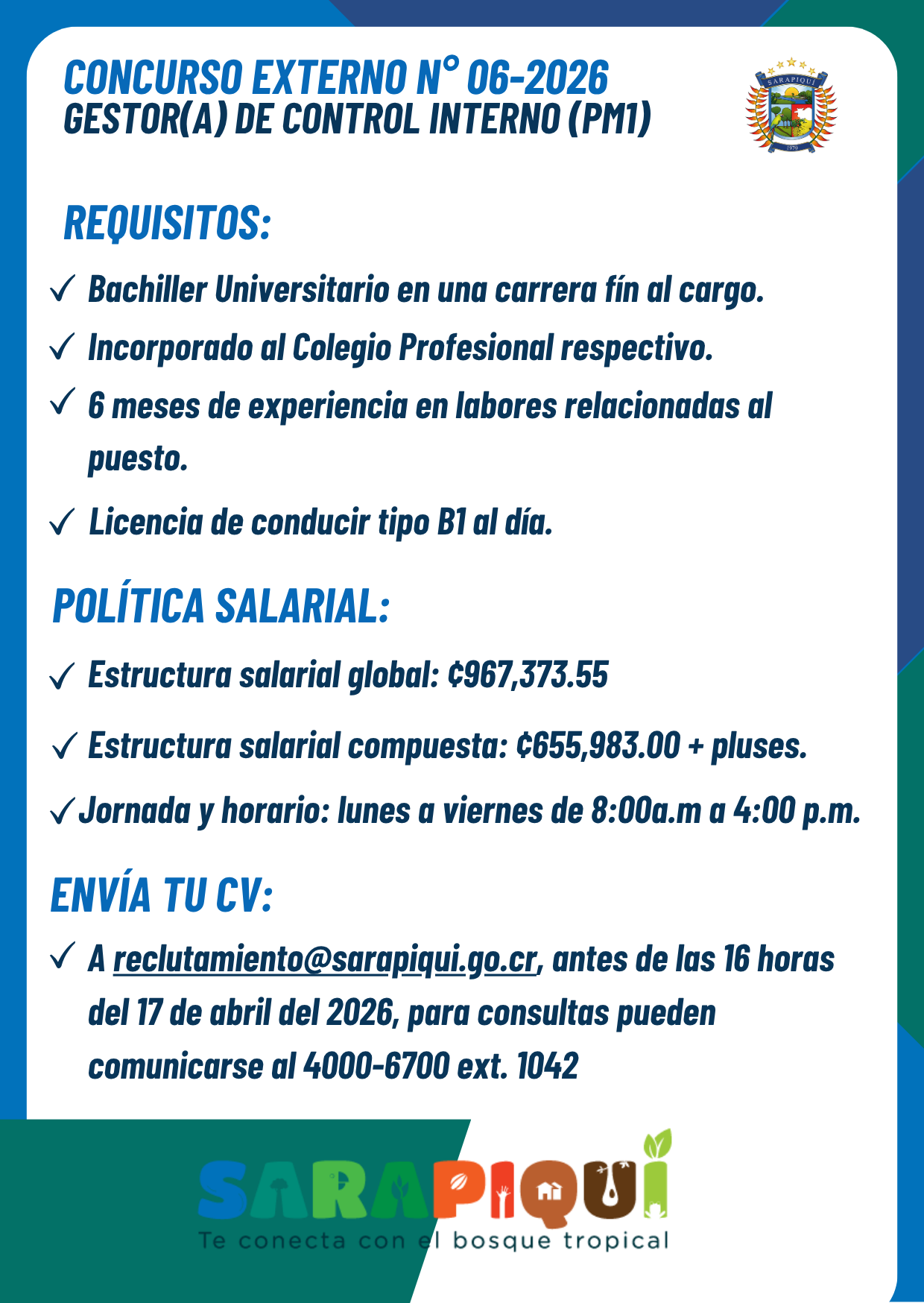 Presentar nota donde indica el interés de participar, así como el número del concurso y hoja de vida, además, documentación que acredite los atestados del concursante, deberán ser remitidas al correo electrónico: reclutamiento@sarapiqui.go.cr, antes de las 16 horas del 17 de abril del 2026.