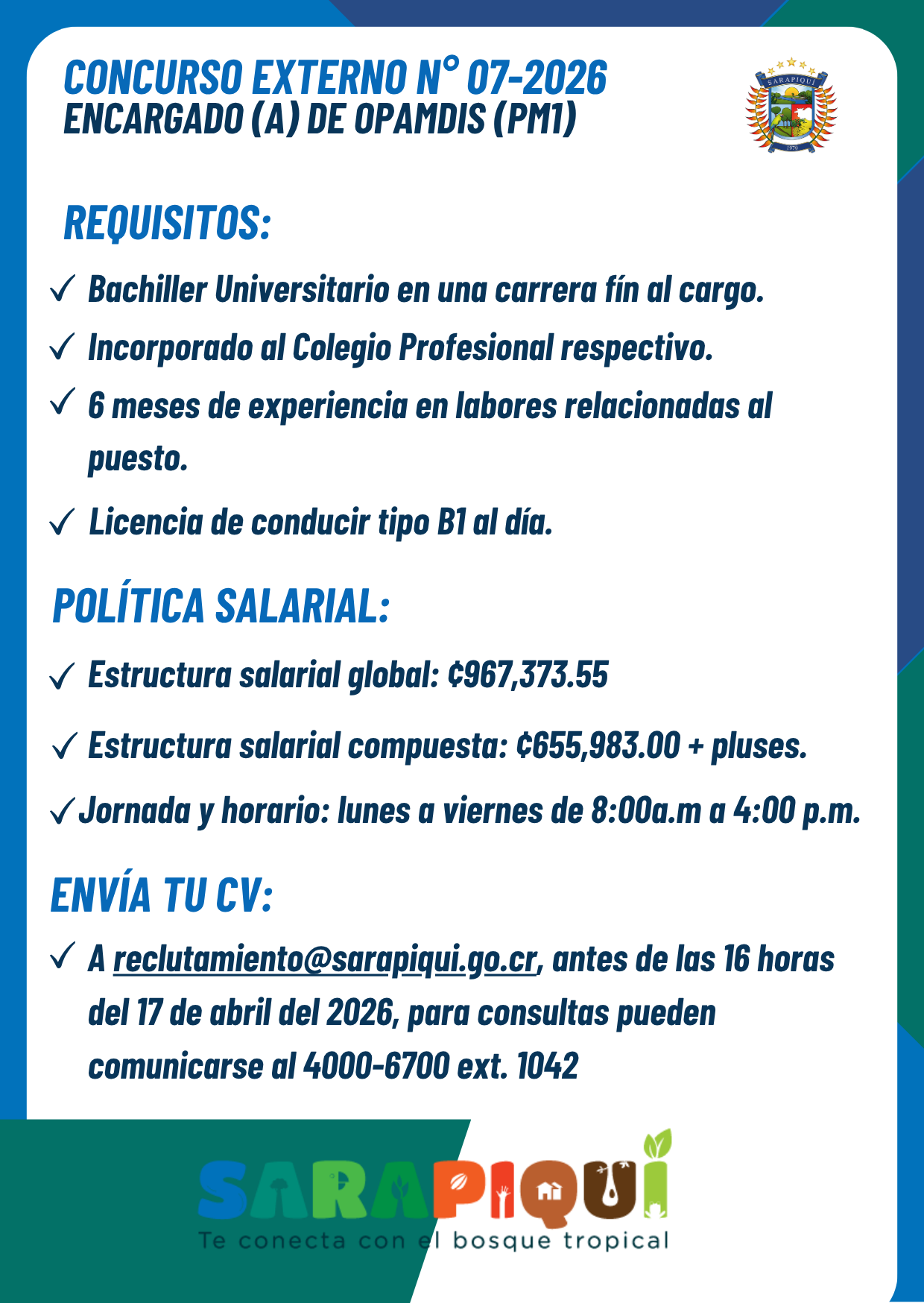 Presentar nota donde indica el interés de participar, así como el número del concurso y hoja de vida, además, documentación que acredite los atestados del concursante, deberán ser remitidas al correo electrónico: reclutamiento@sarapiqui.go.cr, antes de las 16 horas del 17 de abril del 2026.